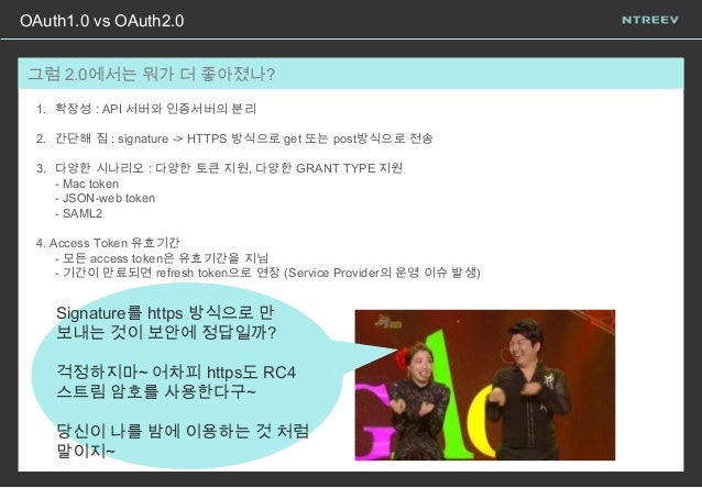 16. 16. OAuth1.0 vs OAuth2.0 당…당황하셨어요~? 그럼 2.0에서는 뭐가 더 좋아졌나? 1. 확장성 : API 서버와 인증서버의 분리 2. 간단해 짐 : signature -> HTTPS 방식으로 get 또는 post방식으로 전송 3. 다양한 시나리오 : 다양한 토큰 지원, 다양한 GRANT TYPE 지원 - Mac token - JSON-web token - SAML2 4. Access Token 유효기간 - 모든 access token은 유효기간을 지님 - 기간이 만료되면 refresh token으로 연장 (Service Provider의 운영 이슈 발생) Signature를 https 방식으로 만 보내는 것이 보안에 정답일까? 걱정하지마~ 어차피 https도 RC4 스트림 암호를 사용한다구~ 당신이 나를 밤에 이용하는 것 처럼 말이지~