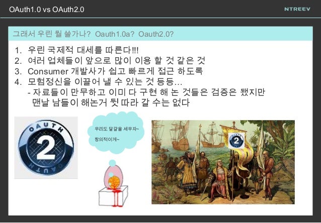 17. 17. OAuth1.0 vs OAuth2.0 당…당황하셨어요~? 그래서 우린 뭘 쓸가나? Oauth1.0a? Oauth2.0? 1. 우린 국제적 대세를 따른다!!! 2. 여러 업체들이 앞으로 많이 이용 할 것 같은 것 3. Consumer 개발사가 쉽고 빠르게 접근 하도록 4. 모험정신을 이끌어 낼 수 있는 것 등등… - 자료들이 만무하고 이미 다 구현 해 논 것들은 검증은 됐지만 맨날 남들이 해논거 뒷 따라 갈 수는 없다 우리도 달걀을 세우자~ 창의적이게~