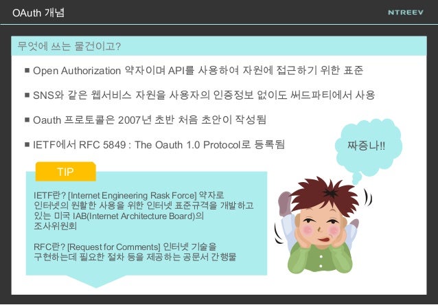 http://fr.slideshare.net/deview/hello-world-oauth : 실전 OAuth A to Z 오창훈 (개념과 기...