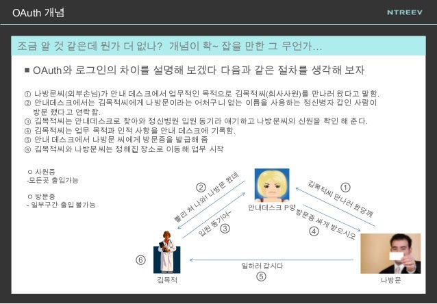 5. 5. OAuth 개념 조금 알 것 같은데 뭔가 더 없나? 개념이 확~ 잡을 만한 그 무언가… ■ OAuth와 로그인의 차이를 설명해 보겠다 다음과 같은 절차를 생각해 보자 ① 나방문씨(외부손님)가 안내 데스크에서 업무적인 목적으로 김목적씨(회사사원)를 만나러 왔다고 말함. ② 안내데스크에서는 김목적씨에게 나방문이라는 어처구니 없는 이름을 사용하는 정신병자 갑인 사람이 방문 했다고 연락함. ③ 김목적씨는 안내데스크로 찾아와 정신병원 입원 동기라 얘기하고 나방문씨의 신원을 확인 해 준다. ④ 김목적씨는 업무 목적과 인적 사항을 안내 데스크에 기록함. ⑤ 안내 데스크에서 나방문 씨에게 방문증을 발급해 줌 ⑥ 김목적씨와 나방문씨는 정해진 장소로 이동해 업무 시작 나방문김목적 안내데스크 P양 일하러 갑시다 ㅇ 사원증 -모든곳 출입가능 ㅇ 방문증 - 일부구간 출입 불가능 ①② ③ ④ ⑤ ⑥
