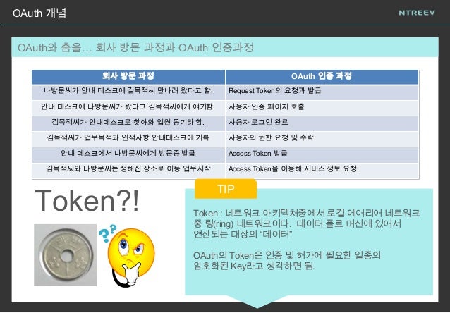8. 8. OAuth 개념 OAuth와 춤을… 회사 방문 과정과 OAuth 인증과정 회사 방문 과정 OAuth 인증 과정 나방문씨가 안내 데스크에 김목적씨 만나러 왔다고 함. Request Token의 요청과 발급 안내 데스크에 나방문씨가 왔다고 김목적씨에게 얘기함. 사용자 인증 페이지 호출 김목적씨가 안내데스크로 찾아와 입원 동기라 함. 사용자 로그인 완료 김목적씨가 업무목적과 인적사항 안내데스크에 기록 사용자의 권한 요청 및 수락 안내 데스크에서 나방문씨에게 방문증 발급 Access Token 발급 김목적씨와 나방문씨는 정해진 장소로 이동 업무시작 Access Token을 이용해 서비스 정보 요청 Token?! TIP Token : 네트워크 아키텍처중에서 로컬 에어리어 네트워크 중 링(ring) 네트워크이다. 데이터 플로 머신에 있어서 연산되는 대상의 “데이터” OAuth의 Token은 인증 및 허가에 필요한 일종의 암호화된 Key라고 생각하면 됨.