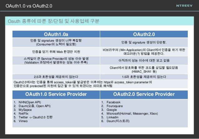9. 9. Oauth 종류에 따른 장/단점 및 사용업체 구분 OAuth1.0 vs OAuth2.0 OAuth1.0a OAuth2.0 인증 및 signature 생성이 너무 복잡함 (Consumer의 노력이 필요함) 인증 및 signature 생성이 단순함. 인증을 얻기 위해 Web 환경만 지원 비브라우져 (Win Application)의 Client에서 인증을 하기 위한 매끄러운(?) 방법을 제공한다. 스케일이 큰 Service Provider의 성능 이슈 발생 (Validation 과정에서 발생하는 성능 이슈 추측) 아직까지 성능 이슈에 대한 보고 없음 Client에서 암호화를 위한 코드를 삽입할 필요없음 (HMAC_SHA1 등) 2.0과 호환성을 제공하지 않는다 1.0과 호환성을 제공하지 않는다 Oauth2.0에서는 인증을 통해 access_token을 발급받은 이후에는 https와 access_token parameter의 인증만으로 protected된 자원에 접근 할 수 있게 하겠다는 의미로 해석됨 OAuth1.0 Service Provider OAuth2.0 Service Provider 1. NHN(Open API) 2. Daum(요즘, Open API) 3. MySapce 4. NetFlix 5. Twitter -> Oauth2.0 전환 6. Vimeo 1. Facebook 2. Foursquare 3. Google 4. Microsoft(Hotmail, Messenger, Xbox) 5. Linkedin 6. Daum(티스토리)