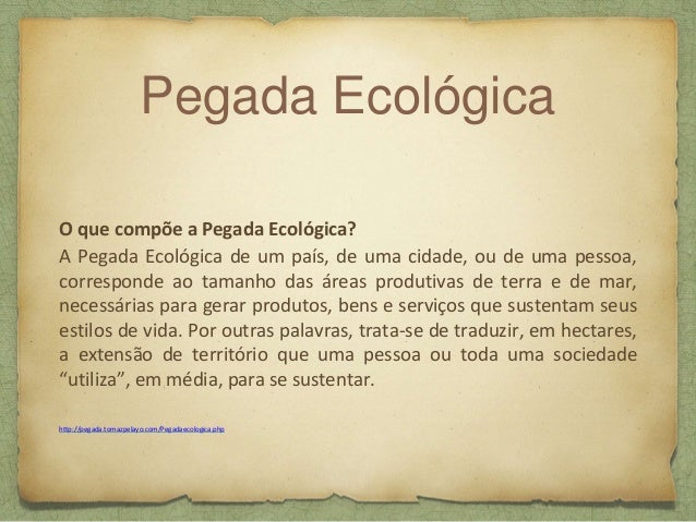 2. 2. Pegada Ecológica O que compõe a Pegada Ecológica? A Pegada Ecológica de um país, de uma cidade, ou de uma pessoa, corresponde ao tamanho das áreas produtivas de terra e de mar, necessárias para gerar produtos, bens e serviços que sustentam seus estilos de vida. Por outras palavras, trata-se de traduzir, em hectares, a extensão de território que uma pessoa ou toda uma sociedade “utiliza”, em média, para se sustentar. http://pegada.tomazpelayo.com/Pegadaecologica.php