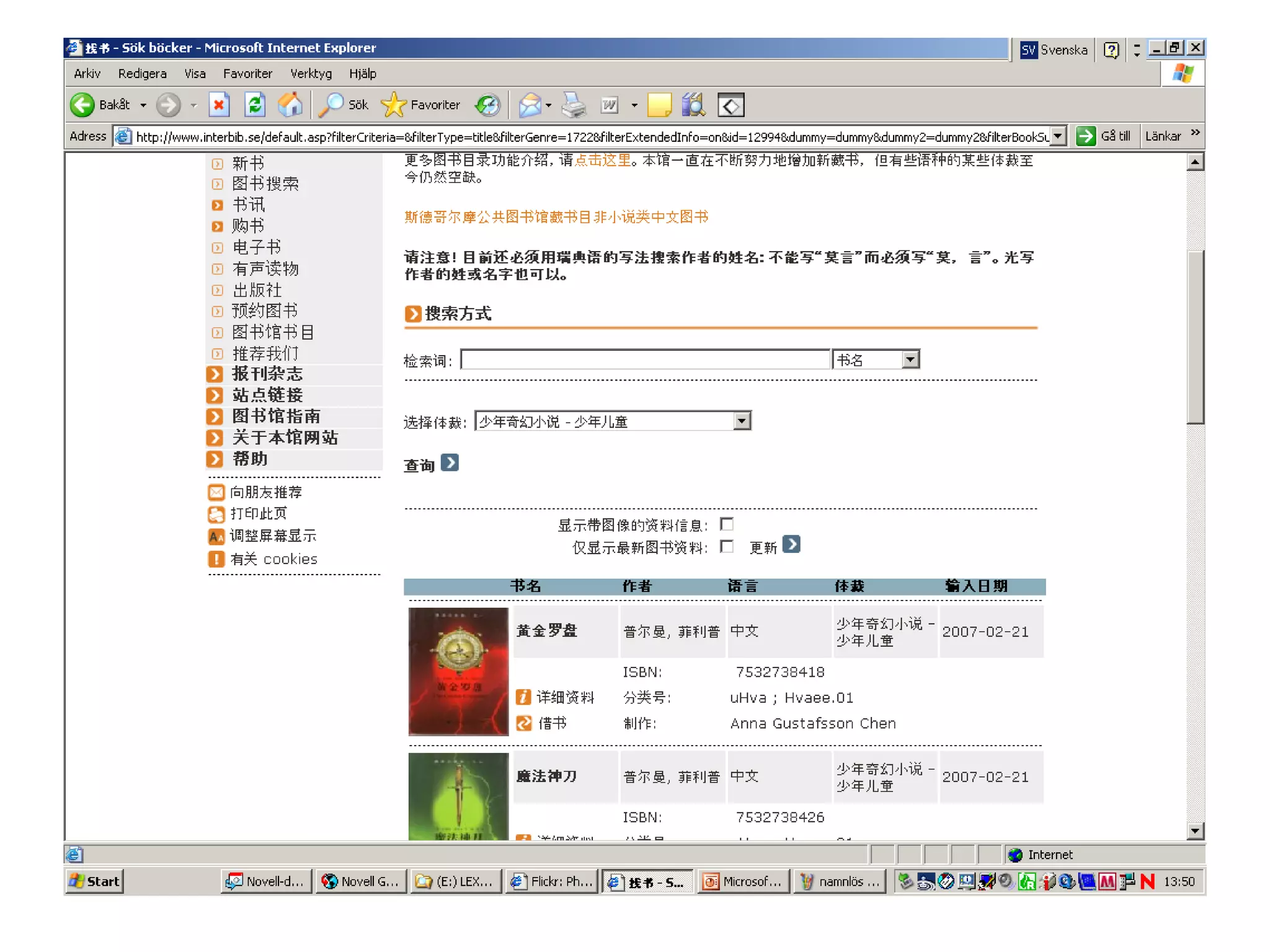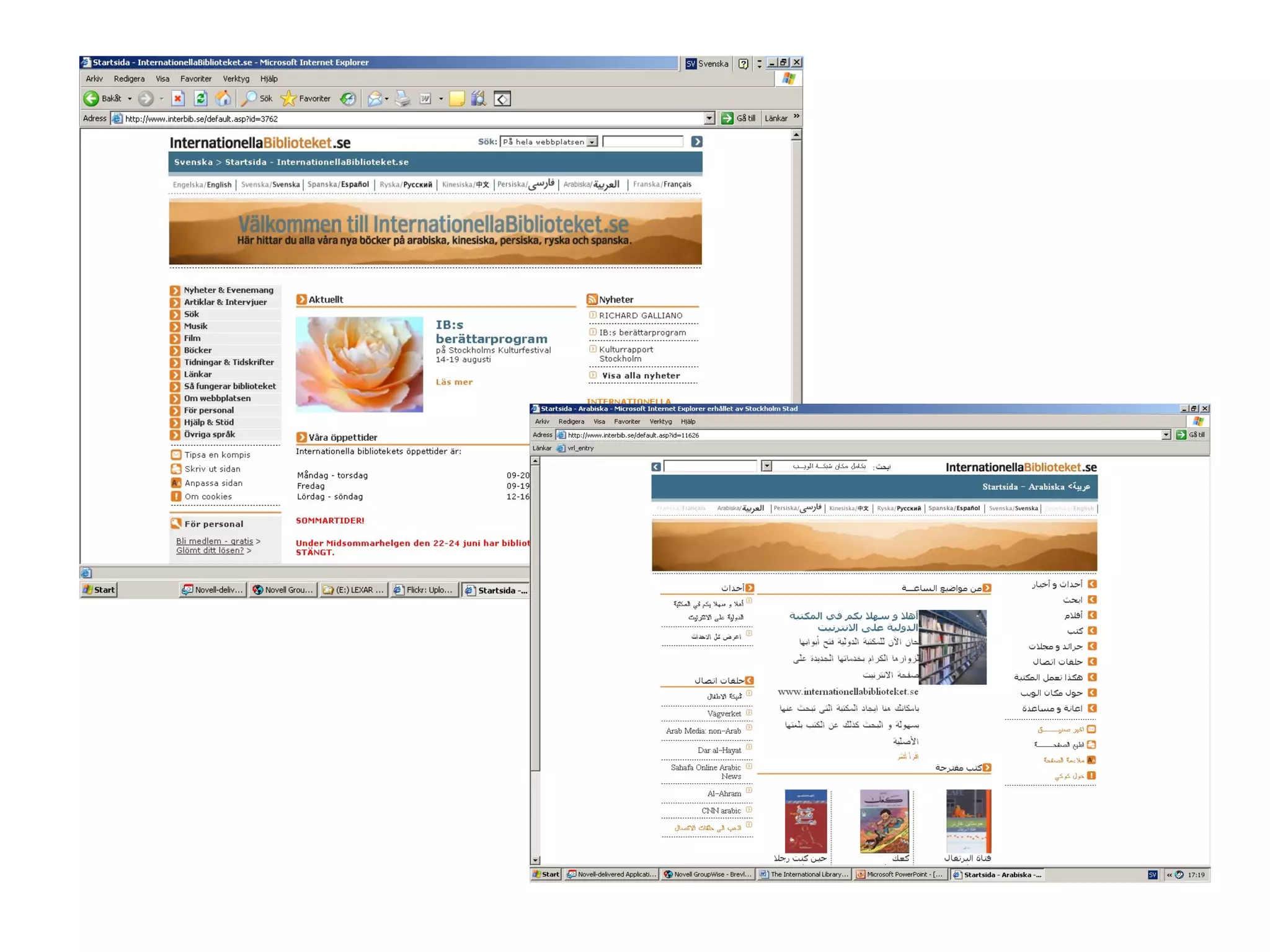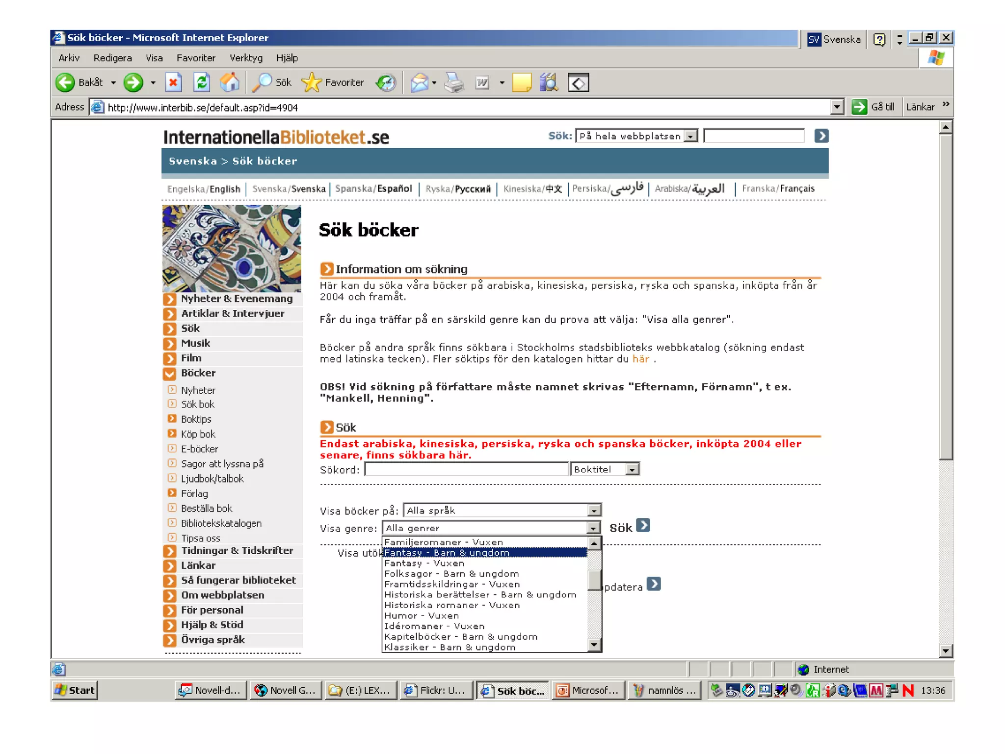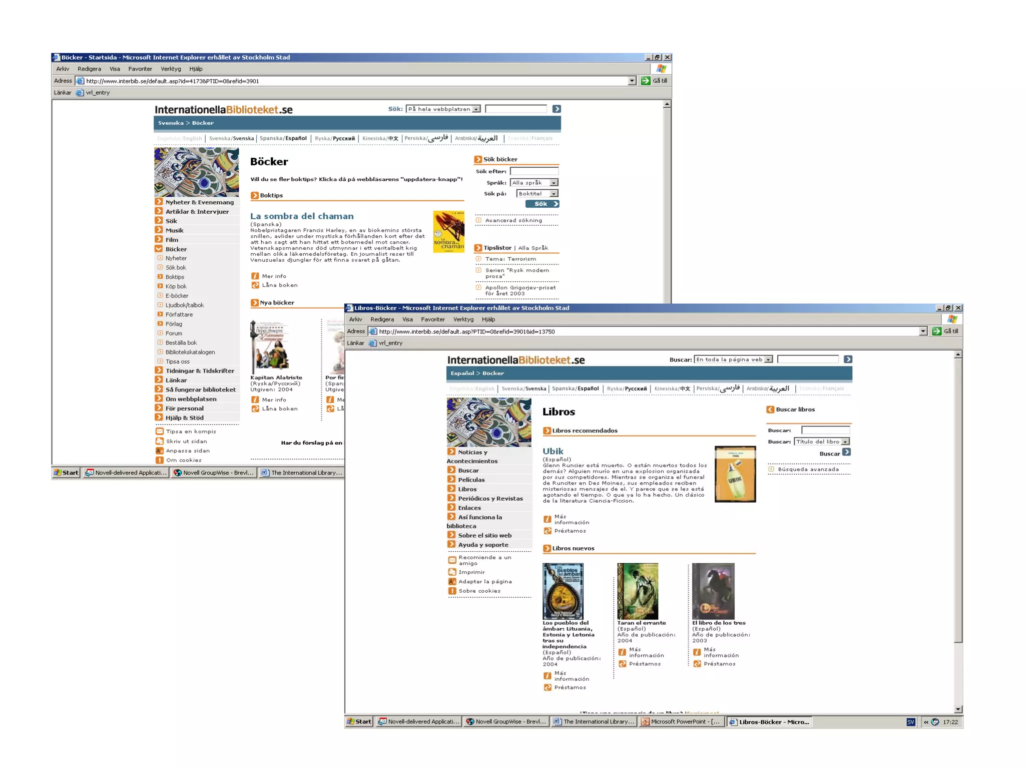 The International Library Online is a multilingual website funded by Swedish cultural organizations, featuring around 220,000 volumes in over 120 languages. More than half of its users do not visit the library in person, and the library's catalogue is only available in one language using Latin script. This limitation may hinder users from accessing materials in their own language due to various transliteration systems.
