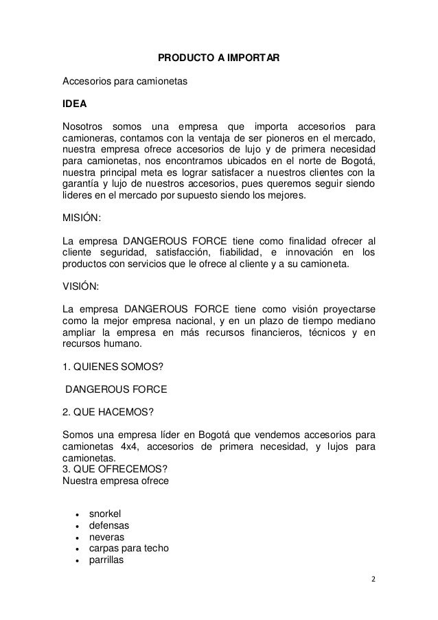 2. 2. 2 PRODUCTO A IMPORTAR Accesorios para camionetas IDEA Nosotros somos una empresa que importa accesorios para camioneras, contamos con la ventaja de ser pioneros en el mercado, nuestra empresa ofrece accesorios de lujo y de primera necesidad para camionetas, nos encontramos ubicados en el norte de Bogotá, nuestra principal meta es lograr satisfacer a nuestros clientes con la garantía y lujo de nuestros accesorios, pues queremos seguir siendo lideres en el mercado por supuesto siendo los mejores. MISIÓN: La empresa DANGEROUS FORCE tiene como finalidad ofrecer al cliente seguridad, satisfacción, fiabilidad, e innovación en los productos con servicios que le ofrece al cliente y a su camioneta. VISIÓN: La empresa DANGEROUS FORCE tiene como visión proyectarse como la mejor empresa nacional, y en un plazo de tiempo mediano ampliar la empresa en más recursos financieros, técnicos y en recursos humano. 1. QUIENES SOMOS? DANGEROUS FORCE 2. QUE HACEMOS? Somos una empresa líder en Bogotá que vendemos accesorios para camionetas 4x4, accesorios de primera necesidad, y lujos para camionetas. 3. QUE OFRECEMOS? Nuestra empresa ofrece  snorkel  defensas  neveras  carpas para techo  parrillas
