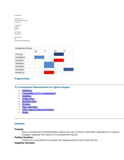 11. 11. 6 CHAPTER 1. DATA REPRESENTATION 1.1.2 Signed Binary Numbers The major drawback with the representation that we’ve used for unsigned binary numbers is that it doesn’t include a way to represent negative numbers. There are a number of ways to extend the unsigned representation to include negative numbers. One of the easiest is to add an additional bit to each number that is used to represent the sign of the number– if this bit is 1, then the number is negative, otherwise the number is positive (or vice versa). This is analogous to the way that we write negative numbers in decimal– if the first symbol in the number is a negative sign, then the number is negative, otherwise the number is positive. Unfortunately, when we try to adapt the algorithm for addition to work properly with this representation, this apparently simple method turns out to cause some trouble. Instead of simply adding the numbers together as we do with unsigned numbers, we now need to consider whether the numbers being added are positive or negative. If one number is positive and the other negative, then we actually need to do subtraction instead of addition, so we’ll need to find an algorithm for subtraction. Furthermore, once we’ve done the subtraction, we need to compare the the unsigned magnitudes of the numbers to determine whether the result is positive or negative. Luckily, there is a representation that allows us to represent negative numbers in such a way that addition (or subtraction) can be done easily, using algorithms very similar to the ones that we already have. The representation that we will use is called two’s complement notation. To introduce two’s complement, we’ll start by defining, in algorithm 1.4, the algorithm that is used to compute the negation of a two’s complement number. Algorithm 1.4 Negation of a two’s complement number. 1. Let x = the logical complement of x. ¯ The logical complement (also called the one’s complement) is formed by flipping all the bits in the number, changing all of the 1 bits to 0, and vice versa. 2. Let X = x + 1. ¯ If this addition overflows, then the overflow bit is discarded. By the definition of two’s complement, X ≡ −x.