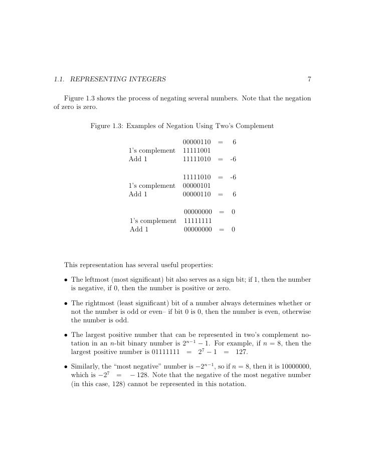 12. 12. 1.1. REPRESENTING INTEGERS 7 Figure 1.3 shows the process of negating several numbers. Note that the negation of zero is zero. Figure 1.3: Examples of Negation Using Two’s Complement 00000110 = 6 1’s complement 11111001 Add 1 11111010 = -6 11111010 = -6 1’s complement 00000101 Add 1 00000110 = 6 00000000 = 0 1’s complement 11111111 Add 1 00000000 = 0 This representation has several useful properties: • The leftmost (most significant) bit also serves as a sign bit; if 1, then the number is negative, if 0, then the number is positive or zero. • The rightmost (least significant) bit of a number always determines whether or not the number is odd or even– if bit 0 is 0, then the number is even, otherwise the number is odd. • The largest positive number that can be represented in two’s complement no- tation in an n-bit binary number is 2n−1 − 1. For example, if n = 8, then the largest positive number is 01111111 = 27 − 1 = 127. • Similarly, the “most negative” number is −2n−1 , so if n = 8, then it is 10000000, which is −27 = − 128. Note that the negative of the most negative number (in this case, 128) cannot be represented in this notation.