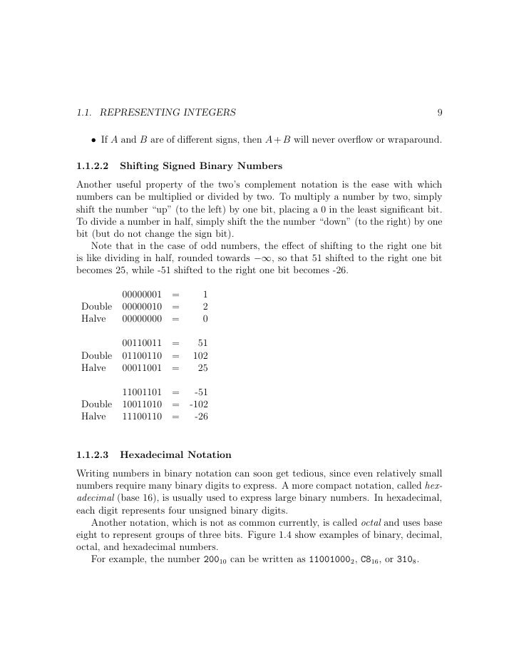14. 14. 1.1. REPRESENTING INTEGERS 9 • If A and B are of different signs, then A + B will never overflow or wraparound. 1.1.2.2 Shifting Signed Binary Numbers Another useful property of the two’s complement notation is the ease with which numbers can be multiplied or divided by two. To multiply a number by two, simply shift the number “up” (to the left) by one bit, placing a 0 in the least significant bit. To divide a number in half, simply shift the the number “down” (to the right) by one bit (but do not change the sign bit). Note that in the case of odd numbers, the effect of shifting to the right one bit is like dividing in half, rounded towards −∞, so that 51 shifted to the right one bit becomes 25, while -51 shifted to the right one bit becomes -26. 00000001 = 1 Double 00000010 = 2 Halve 00000000 = 0 00110011 = 51 Double 01100110 = 102 Halve 00011001 = 25 11001101 = -51 Double 10011010 = -102 Halve 11100110 = -26 1.1.2.3 Hexadecimal Notation Writing numbers in binary notation can soon get tedious, since even relatively small numbers require many binary digits to express. A more compact notation, called hex- adecimal (base 16), is usually used to express large binary numbers. In hexadecimal, each digit represents four unsigned binary digits. Another notation, which is not as common currently, is called octal and uses base eight to represent groups of three bits. Figure 1.4 show examples of binary, decimal, octal, and hexadecimal numbers. For example, the number 20010 can be written as 11001000 2 , C816 , or 3108 .