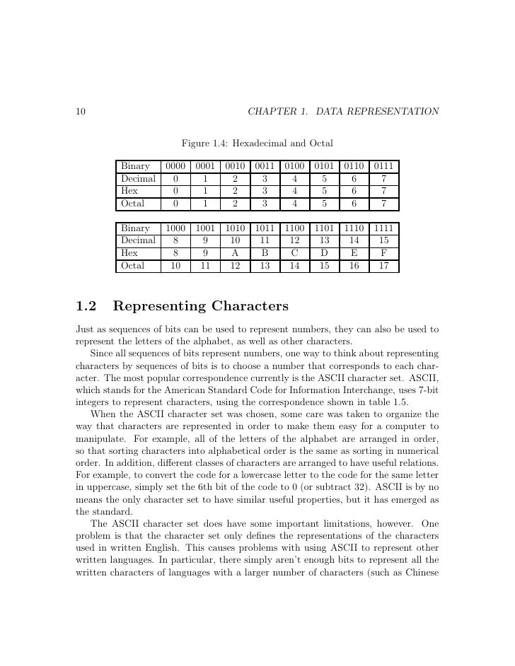 15. 15. 10 CHAPTER 1. DATA REPRESENTATION Figure 1.4: Hexadecimal and Octal Binary 0000 0001 0010 0011 0100 0101 0110 0111 Decimal 0 1 2 3 4 5 6 7 Hex 0 1 2 3 4 5 6 7 Octal 0 1 2 3 4 5 6 7 Binary 1000 1001 1010 1011 1100 1101 1110 1111 Decimal 8 9 10 11 12 13 14 15 Hex 8 9 A B C D E F Octal 10 11 12 13 14 15 16 17 1.2 Representing Characters Just as sequences of bits can be used to represent numbers, they can also be used to represent the letters of the alphabet, as well as other characters. Since all sequences of bits represent numbers, one way to think about representing characters by sequences of bits is to choose a number that corresponds to each char- acter. The most popular correspondence currently is the ASCII character set. ASCII, which stands for the American Standard Code for Information Interchange, uses 7-bit integers to represent characters, using the correspondence shown in table 1.5. When the ASCII character set was chosen, some care was taken to organize the way that characters are represented in order to make them easy for a computer to manipulate. For example, all of the letters of the alphabet are arranged in order, so that sorting characters into alphabetical order is the same as sorting in numerical order. In addition, different classes of characters are arranged to have useful relations. For example, to convert the code for a lowercase letter to the code for the same letter in uppercase, simply set the 6th bit of the code to 0 (or subtract 32). ASCII is by no means the only character set to have similar useful properties, but it has emerged as the standard. The ASCII character set does have some important limitations, however. One problem is that the character set only defines the representations of the characters used in written English. This causes problems with using ASCII to represent other written languages. In particular, there simply aren’t enough bits to represent all the written characters of languages with a larger number of characters (such as Chinese