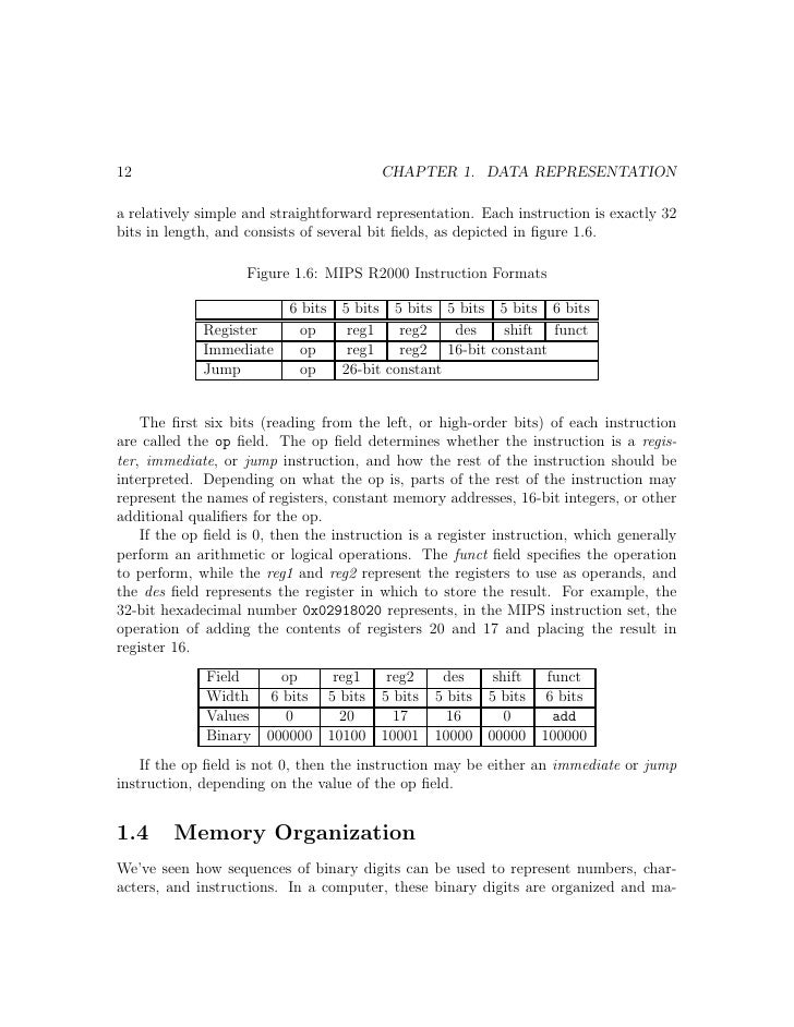 17. 17. 12 CHAPTER 1. DATA REPRESENTATION a relatively simple and straightforward representation. Each instruction is exactly 32 bits in length, and consists of several bit fields, as depicted in figure 1.6. Figure 1.6: MIPS R2000 Instruction Formats 6 bits 5 bits 5 bits 5 bits 5 bits 6 bits Register op reg1 reg2 des shift funct Immediate op reg1 reg2 16-bit constant Jump op 26-bit constant The first six bits (reading from the left, or high-order bits) of each instruction are called the op field. The op field determines whether the instruction is a regis- ter, immediate, or jump instruction, and how the rest of the instruction should be interpreted. Depending on what the op is, parts of the rest of the instruction may represent the names of registers, constant memory addresses, 16-bit integers, or other additional qualifiers for the op. If the op field is 0, then the instruction is a register instruction, which generally perform an arithmetic or logical operations. The funct field specifies the operation to perform, while the reg1 and reg2 represent the registers to use as operands, and the des field represents the register in which to store the result. For example, the 32-bit hexadecimal number 0x02918020 represents, in the MIPS instruction set, the operation of adding the contents of registers 20 and 17 and placing the result in register 16. Field op reg1 reg2 des shift funct Width 6 bits 5 bits 5 bits 5 bits 5 bits 6 bits Values 0 20 17 16 0 add Binary 000000 10100 10001 10000 00000 100000 If the op field is not 0, then the instruction may be either an immediate or jump instruction, depending on the value of the op field. 1.4 Memory Organization We’ve seen how sequences of binary digits can be used to represent numbers, char- acters, and instructions. In a computer, these binary digits are organized and ma-