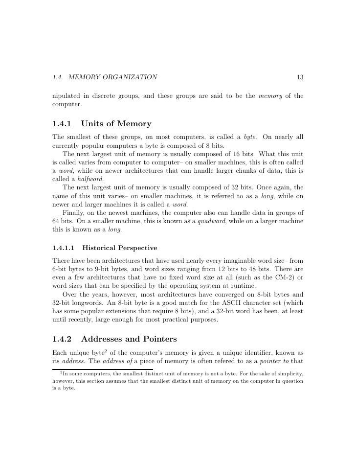 18. 18. 1.4. MEMORY ORGANIZATION 13 nipulated in discrete groups, and these groups are said to be the memory of the computer. 1.4.1 Units of Memory The smallest of these groups, on most computers, is called a byte. On nearly all currently popular computers a byte is composed of 8 bits. The next largest unit of memory is usually composed of 16 bits. What this unit is called varies from computer to computer– on smaller machines, this is often called a word, while on newer architectures that can handle larger chunks of data, this is called a halfword. The next largest unit of memory is usually composed of 32 bits. Once again, the name of this unit varies– on smaller machines, it is referred to as a long, while on newer and larger machines it is called a word. Finally, on the newest machines, the computer also can handle data in groups of 64 bits. On a smaller machine, this is known as a quadword, while on a larger machine this is known as a long. 1.4.1.1 Historical Perspective There have been architectures that have used nearly every imaginable word size– from 6-bit bytes to 9-bit bytes, and word sizes ranging from 12 bits to 48 bits. There are even a few architectures that have no fixed word size at all (such as the CM-2) or word sizes that can be specified by the operating system at runtime. Over the years, however, most architectures have converged on 8-bit bytes and 32-bit longwords. An 8-bit byte is a good match for the ASCII character set (which has some popular extensions that require 8 bits), and a 32-bit word has been, at least until recently, large enough for most practical purposes. 1.4.2 Addresses and Pointers Each unique byte2 of the computer’s memory is given a unique identifier, known as its address. The address of a piece of memory is often refered to as a pointer to that 2 In some computers, the smallest distinct unit of memory is not a byte. For the sake of simplicity, however, this section assumes that the smallest distinct unit of memory on the computer in question is a byte.