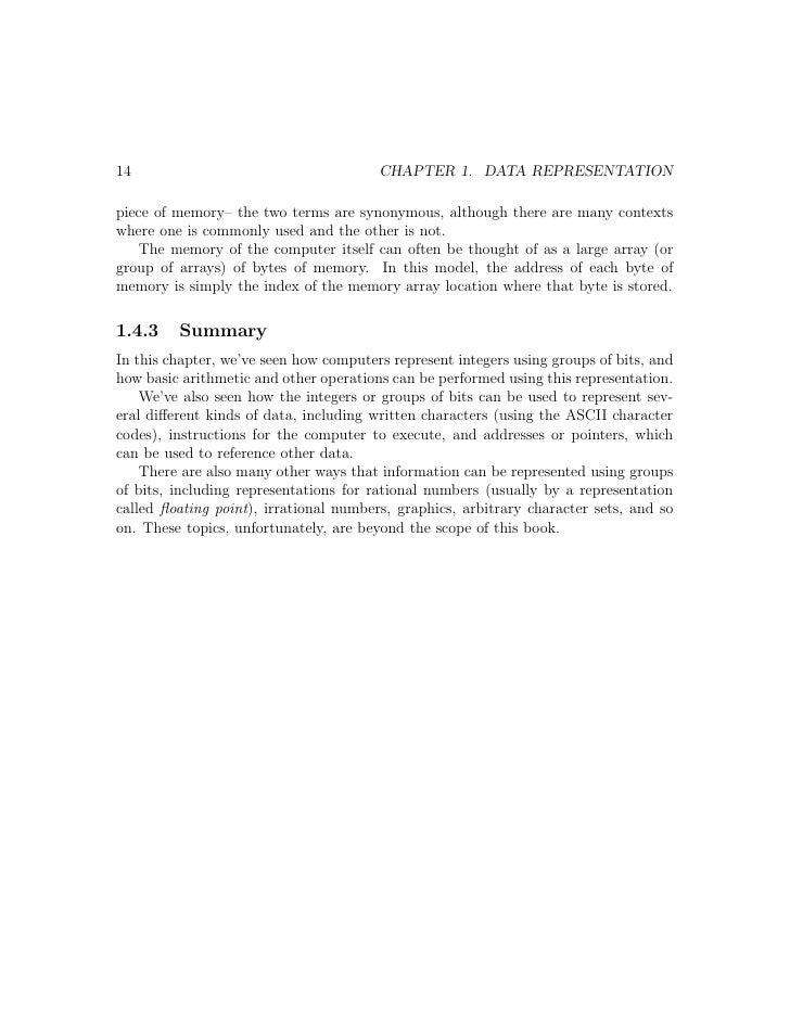 19. 19. 14 CHAPTER 1. DATA REPRESENTATION piece of memory– the two terms are synonymous, although there are many contexts where one is commonly used and the other is not. The memory of the computer itself can often be thought of as a large array (or group of arrays) of bytes of memory. In this model, the address of each byte of memory is simply the index of the memory array location where that byte is stored. 1.4.3 Summary In this chapter, we’ve seen how computers represent integers using groups of bits, and how basic arithmetic and other operations can be performed using this representation. We’ve also seen how the integers or groups of bits can be used to represent sev- eral different kinds of data, including written characters (using the ASCII character codes), instructions for the computer to execute, and addresses or pointers, which can be used to reference other data. There are also many other ways that information can be represented using groups of bits, including representations for rational numbers (usually by a representation called floating point), irrational numbers, graphics, arbitrary character sets, and so on. These topics, unfortunately, are beyond the scope of this book.