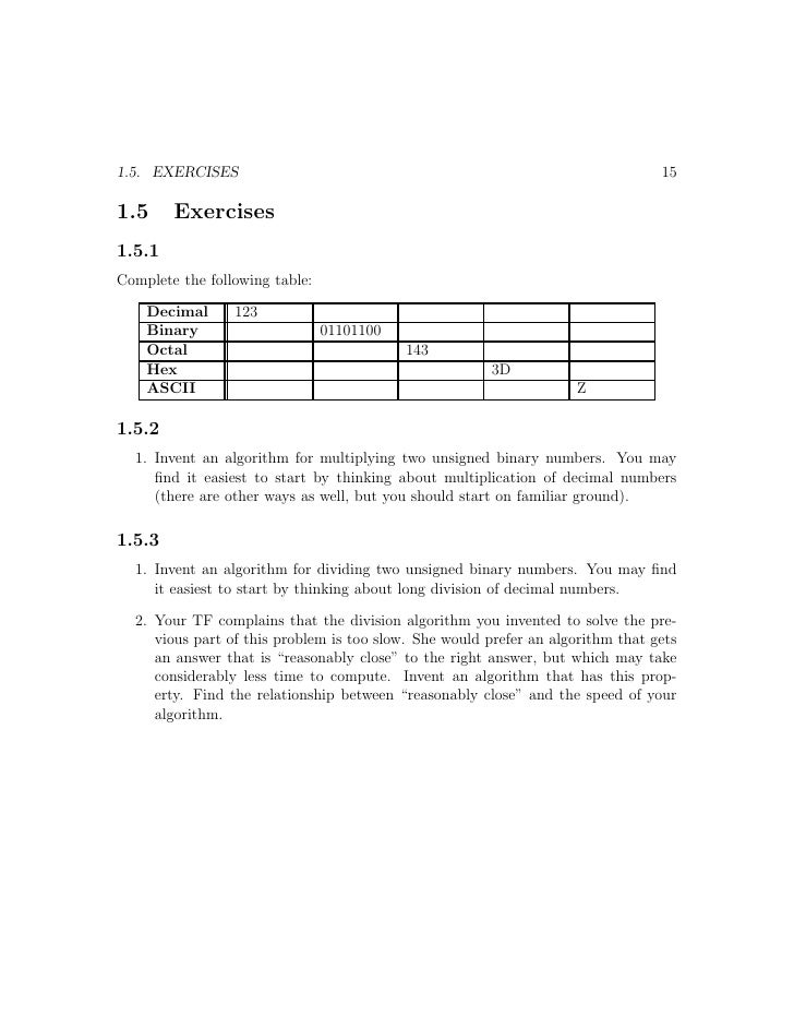 20. 20. 1.5. EXERCISES 15 1.5 Exercises 1.5.1 Complete the following table: Decimal 123 Binary 01101100 Octal 143 Hex 3D ASCII Z 1.5.2 1. Invent an algorithm for multiplying two unsigned binary numbers. You may find it easiest to start by thinking about multiplication of decimal numbers (there are other ways as well, but you should start on familiar ground). 1.5.3 1. Invent an algorithm for dividing two unsigned binary numbers. You may find it easiest to start by thinking about long division of decimal numbers. 2. Your TF complains that the division algorithm you invented to solve the pre- vious part of this problem is too slow. She would prefer an algorithm that gets an answer that is “reasonably close” to the right answer, but which may take considerably less time to compute. Invent an algorithm that has this prop- erty. Find the relationship between “reasonably close” and the speed of your algorithm.