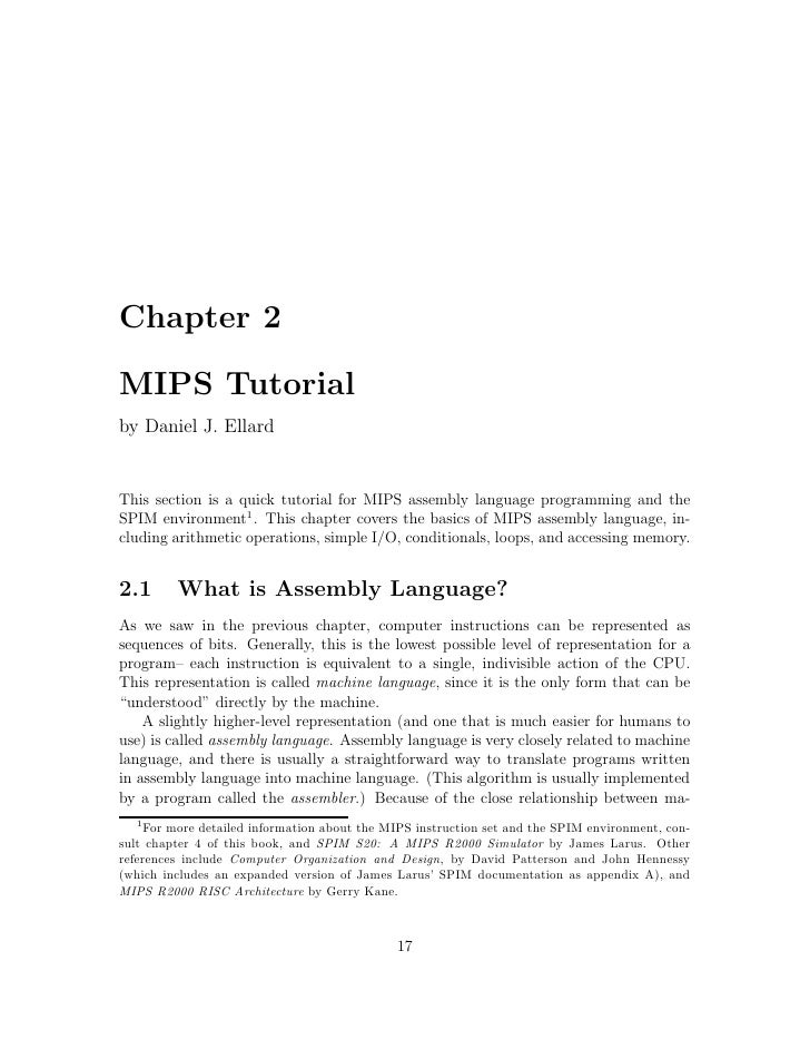 22. 22. Chapter 2 MIPS Tutorial by Daniel J. Ellard This section is a quick tutorial for MIPS assembly language programming and the SPIM environment1 . This chapter covers the basics of MIPS assembly language, in- cluding arithmetic operations, simple I/O, conditionals, loops, and accessing memory. 2.1 What is Assembly Language? As we saw in the previous chapter, computer instructions can be represented as sequences of bits. Generally, this is the lowest possible level of representation for a program– each instruction is equivalent to a single, indivisible action of the CPU. This representation is called machine language, since it is the only form that can be “understood” directly by the machine. A slightly higher-level representation (and one that is much easier for humans to use) is called assembly language. Assembly language is very closely related to machine language, and there is usually a straightforward way to translate programs written in assembly language into machine language. (This algorithm is usually implemented by a program called the assembler.) Because of the close relationship between ma- 1 For more detailed information about the MIPS instruction set and the SPIM environment, con- sult chapter 4 of this book, and SPIM S20: A MIPS R2000 Simulator by James Larus. Other references include Computer Organization and Design, by David Patterson and John Hennessy (which includes an expanded version of James Larus’ SPIM documentation as appendix A), and MIPS R2000 RISC Architecture by Gerry Kane. 17