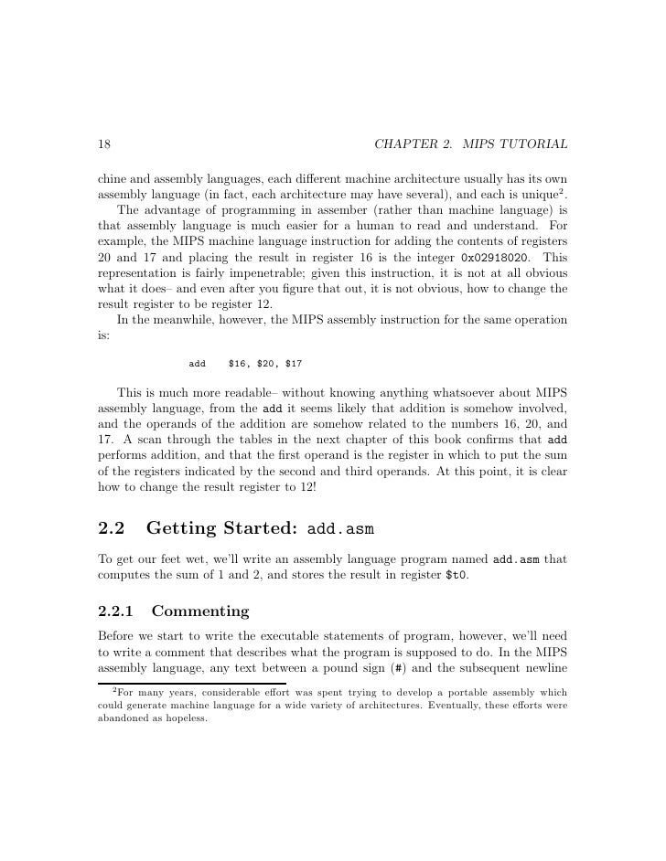 23. 23. 18 CHAPTER 2. MIPS TUTORIAL chine and assembly languages, each different machine architecture usually has its own assembly language (in fact, each architecture may have several), and each is unique 2 . The advantage of programming in assember (rather than machine language) is that assembly language is much easier for a human to read and understand. For example, the MIPS machine language instruction for adding the contents of registers 20 and 17 and placing the result in register 16 is the integer 0x02918020. This representation is fairly impenetrable; given this instruction, it is not at all obvious what it does– and even after you figure that out, it is not obvious, how to change the result register to be register 12. In the meanwhile, however, the MIPS assembly instruction for the same operation is: add $16, $20, $17 This is much more readable– without knowing anything whatsoever about MIPS assembly language, from the add it seems likely that addition is somehow involved, and the operands of the addition are somehow related to the numbers 16, 20, and 17. A scan through the tables in the next chapter of this book confirms that add performs addition, and that the first operand is the register in which to put the sum of the registers indicated by the second and third operands. At this point, it is clear how to change the result register to 12! 2.2 Getting Started: add.asm To get our feet wet, we’ll write an assembly language program named add.asm that computes the sum of 1 and 2, and stores the result in register $t0. 2.2.1 Commenting Before we start to write the executable statements of program, however, we’ll need to write a comment that describes what the program is supposed to do. In the MIPS assembly language, any text between a pound sign (#) and the subsequent newline 2 For many years, considerable effort was spent trying to develop a portable assembly which could generate machine language for a wide variety of architectures. Eventually, these efforts were abandoned as hopeless.