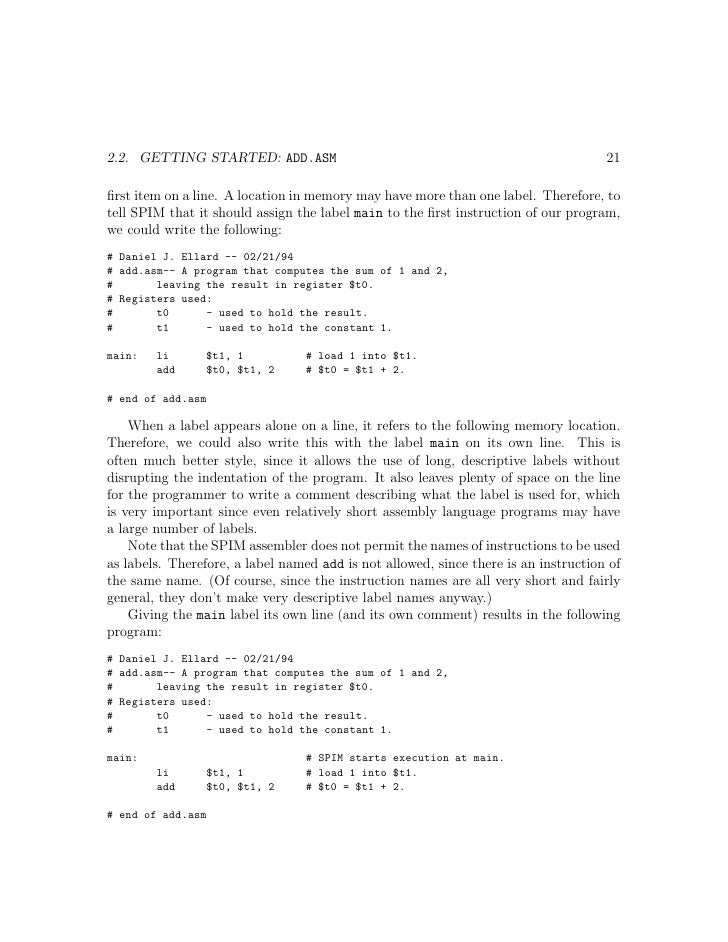 26. 26. 2.2. GETTING STARTED: ADD.ASM 21 first item on a line. A location in memory may have more than one label. Therefore, to tell SPIM that it should assign the label main to the first instruction of our program, we could write the following: # Daniel J. Ellard -- 02/21/94 # add.asm-- A program that computes the sum of 1 and 2, # leaving the result in register $t0. # Registers used: # t0 - used to hold the result. # t1 - used to hold the constant 1. main: li $t1, 1 # load 1 into $t1. add $t0, $t1, 2 # $t0 = $t1 + 2. # end of add.asm When a label appears alone on a line, it refers to the following memory location. Therefore, we could also write this with the label main on its own line. This is often much better style, since it allows the use of long, descriptive labels without disrupting the indentation of the program. It also leaves plenty of space on the line for the programmer to write a comment describing what the label is used for, which is very important since even relatively short assembly language programs may have a large number of labels. Note that the SPIM assembler does not permit the names of instructions to be used as labels. Therefore, a label named add is not allowed, since there is an instruction of the same name. (Of course, since the instruction names are all very short and fairly general, they don’t make very descriptive label names anyway.) Giving the main label its own line (and its own comment) results in the following program: # Daniel J. Ellard -- 02/21/94 # add.asm-- A program that computes the sum of 1 and 2, # leaving the result in register $t0. # Registers used: # t0 - used to hold the result. # t1 - used to hold the constant 1. main: # SPIM starts execution at main. li $t1, 1 # load 1 into $t1. add $t0, $t1, 2 # $t0 = $t1 + 2. # end of add.asm