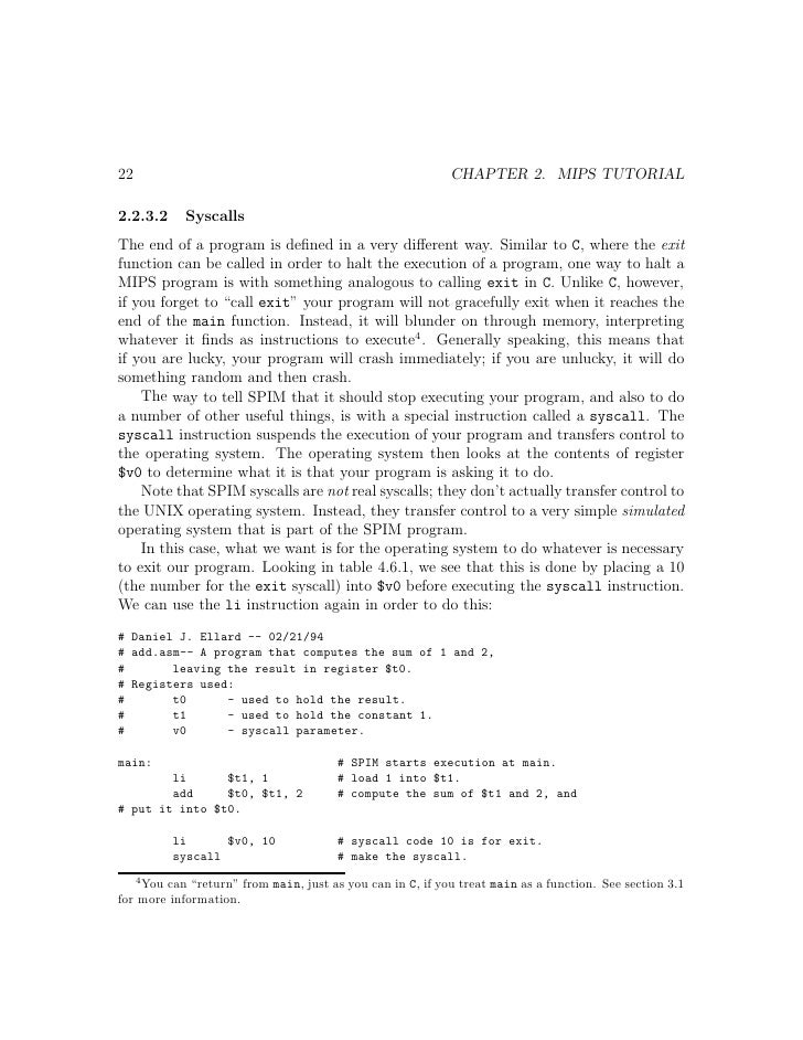 25. 25. 20 CHAPTER 2. MIPS TUTORIAL is an essential part of the commenting) we select $t1, and make note of this in the comments. 3. A register which holds the second number, or a 32-bit constant. In this case, since 2 is a constant that fits in 32 bits, we can just use 2 as the third operand of add. We now know how we can add the numbers, but we have to figure out how to get 1 into register $t1. To do this, we can use the li (load immediate value) instruction, which loads a 32-bit constant into a register. Therefore, we arrive at the following sequence of instructions: # Daniel J. Ellard -- 02/21/94 # add.asm-- A program that computes the sum of 1 and 2, # leaving the result in register $t0. # Registers used: # t0 - used to hold the result. # t1 - used to hold the constant 1. li $t1, 1 # load 1 into $t1. add $t0, $t1, 2 # $t0 = $t1 + 2. # end of add.asm 2.2.3 Completing the Program These two instructions perform the calculation that we want, but they do not form a complete program. Much like C, an assembly language program must contain some additional information that tells the assembler where the program begins and ends. The exact form of this information varies from assembler to assembler (note that there may be more than one assembler for a given architecture, and there are several for the MIPS architecture). This tutorial will assume that SPIM is being used as the assembler and runtime environment. 2.2.3.1 Labels and main To begin with, we need to tell the assembler where the program starts. In SPIM, program execution begins at the location with the label main. A label is a symbolic name for an address in memory. In MIPS assembly, a label is a symbol name (following the same conventions as C symbol names), followed by a colon. Labels must be the