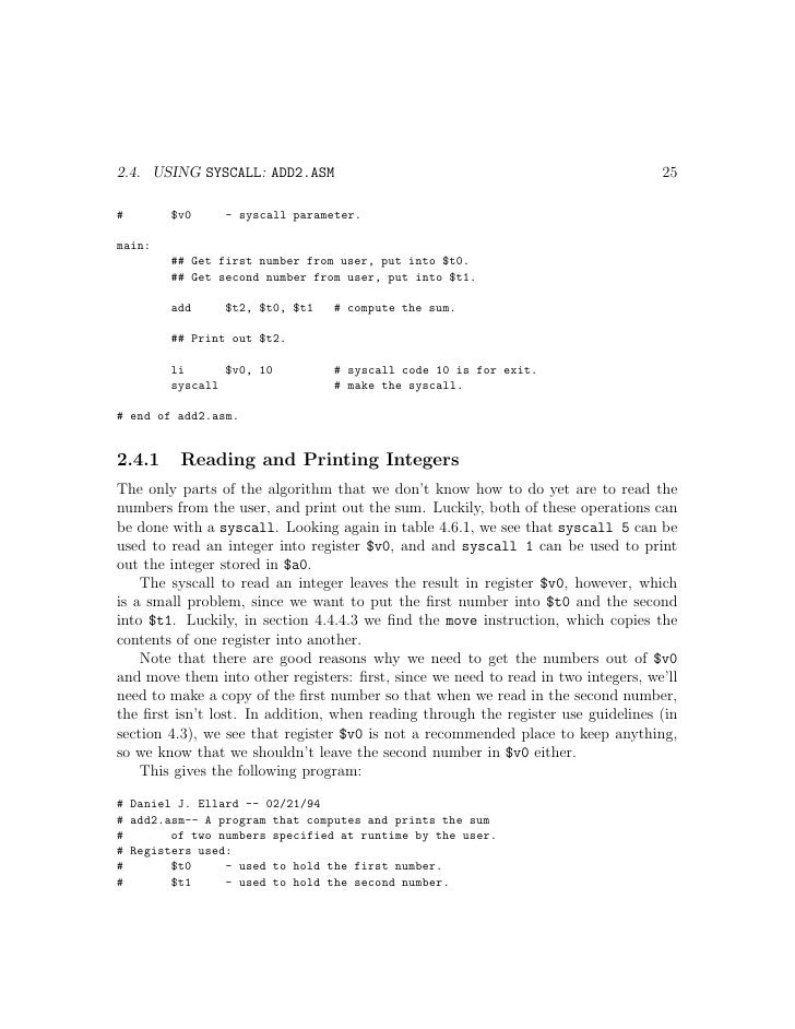 30. 30. 2.4. USING SYSCALL: ADD2.ASM 25 # $v0 - syscall parameter. main: ## Get first number from user, put into $t0. ## Get second number from user, put into $t1. add $t2, $t0, $t1 # compute the sum. ## Print out $t2. li $v0, 10 # syscall code 10 is for exit. syscall # make the syscall. # end of add2.asm. 2.4.1 Reading and Printing Integers The only parts of the algorithm that we don’t know how to do yet are to read the numbers from the user, and print out the sum. Luckily, both of these operations can be done with a syscall. Looking again in table 4.6.1, we see that syscall 5 can be used to read an integer into register $v0, and and syscall 1 can be used to print out the integer stored in $a0. The syscall to read an integer leaves the result in register $v0, however, which is a small problem, since we want to put the first number into $t0 and the second into $t1. Luckily, in section 4.4.4.3 we find the move instruction, which copies the contents of one register into another. Note that there are good reasons why we need to get the numbers out of $v0 and move them into other registers: first, since we need to read in two integers, we’ll need to make a copy of the first number so that when we read in the second number, the first isn’t lost. In addition, when reading through the register use guidelines (in section 4.3), we see that register $v0 is not a recommended place to keep anything, so we know that we shouldn’t leave the second number in $v0 either. This gives the following program: # Daniel J. Ellard -- 02/21/94 # add2.asm-- A program that computes and prints the sum # of two numbers specified at runtime by the user. # Registers used: # $t0 - used to hold the first number. # $t1 - used to hold the second number.