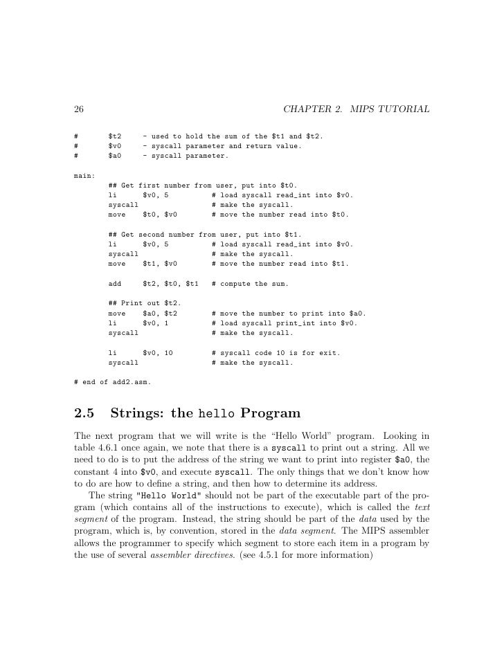 31. 31. 26 CHAPTER 2. MIPS TUTORIAL # $t2 - used to hold the sum of the $t1 and $t2. # $v0 - syscall parameter and return value. # $a0 - syscall parameter. main: ## Get first number from user, put into $t0. li $v0, 5 # load syscall read_int into $v0. syscall # make the syscall. move $t0, $v0 # move the number read into $t0. ## Get second number from user, put into $t1. li $v0, 5 # load syscall read_int into $v0. syscall # make the syscall. move $t1, $v0 # move the number read into $t1. add $t2, $t0, $t1 # compute the sum. ## Print out $t2. move $a0, $t2 # move the number to print into $a0. li $v0, 1 # load syscall print_int into $v0. syscall # make the syscall. li $v0, 10 # syscall code 10 is for exit. syscall # make the syscall. # end of add2.asm. 2.5 Strings: the hello Program The next program that we will write is the “Hello World” program. Looking in table 4.6.1 once again, we note that there is a syscall to print out a string. All we need to do is to put the address of the string we want to print into register $a0, the constant 4 into $v0, and execute syscall. The only things that we don’t know how to do are how to define a string, and then how to determine its address. The string "Hello World" should not be part of the executable part of the pro- gram (which contains all of the instructions to execute), which is called the text segment of the program. Instead, the string should be part of the data used by the program, which is, by convention, stored in the data segment. The MIPS assembler allows the programmer to specify which segment to store each item in a program by the use of several assembler directives. (see 4.5.1 for more information)