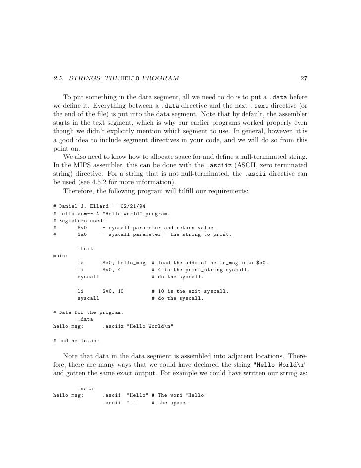 32. 32. 2.5. STRINGS: THE HELLO PROGRAM 27 To put something in the data segment, all we need to do is to put a .data before we define it. Everything between a .data directive and the next .text directive (or the end of the file) is put into the data segment. Note that by default, the assembler starts in the text segment, which is why our earlier programs worked properly even though we didn’t explicitly mention which segment to use. In general, however, it is a good idea to include segment directives in your code, and we will do so from this point on. We also need to know how to allocate space for and define a null-terminated string. In the MIPS assembler, this can be done with the .asciiz (ASCII, zero terminated string) directive. For a string that is not null-terminated, the .ascii directive can be used (see 4.5.2 for more information). Therefore, the following program will fulfill our requirements: # Daniel J. Ellard -- 02/21/94 # hello.asm-- A "Hello World" program. # Registers used: # $v0 - syscall parameter and return value. # $a0 - syscall parameter-- the string to print. .text main: la $a0, hello_msg # load the addr of hello_msg into $a0. li $v0, 4 # 4 is the print_string syscall. syscall # do the syscall. li $v0, 10 # 10 is the exit syscall. syscall # do the syscall. # Data for the program: .data hello_msg: .asciiz "Hello Worldn" # end hello.asm Note that data in the data segment is assembled into adjacent locations. There- fore, there are many ways that we could have declared the string "Hello Worldn" and gotten the same exact output. For example we could have written our string as: .data hello_msg: .ascii "Hello" # The word "Hello" .ascii " " # the space.