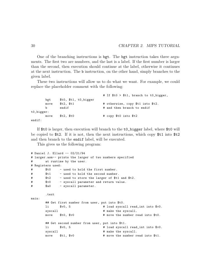 35. 35. 30 CHAPTER 2. MIPS TUTORIAL One of the branching instructions is bgt. The bgt instruction takes three argu- ments. The first two are numbers, and the last is a label. If the first number is larger than the second, then execution should continue at the label, otherwise it continues at the next instruction. The b instruction, on the other hand, simply branches to the given label. These two instructions will allow us to do what we want. For example, we could replace the placeholder comment with the following: # If $t0 > $t1, branch to t0_bigger, bgt $t0, $t1, t0_bigger move $t2, $t1 # otherwise, copy $t1 into $t2. b endif # and then branch to endif t0_bigger: move $t2, $t0 # copy $t0 into $t2 endif: If $t0 is larger, then execution will branch to the t0_bigger label, where $t0 will be copied to $t2. If it is not, then the next instructions, which copy $t1 into $t2 and then branch to the endif label, will be executed. This gives us the following program: # Daniel J. Ellard -- 02/21/94 # larger.asm-- prints the larger of two numbers specified # at runtime by the user. # Registers used: # $t0 - used to hold the first number. # $t1 - used to hold the second number. # $t2 - used to store the larger of $t1 and $t2. # $v0 - syscall parameter and return value. # $a0 - syscall parameter. .text main: ## Get first number from user, put into $t0. li $v0, 5 # load syscall read_int into $v0. syscall # make the syscall. move $t0, $v0 # move the number read into $t0. ## Get second number from user, put into $t1. li $v0, 5 # load syscall read_int into $v0. syscall # make the syscall. move $t1, $v0 # move the number read into $t1.