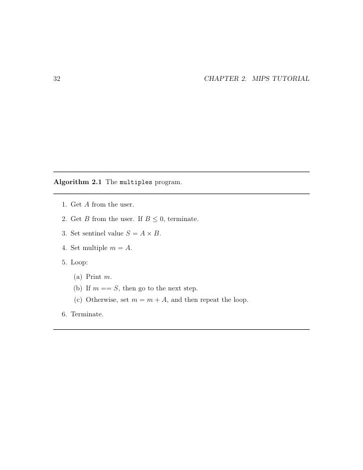 37. 37. 32 CHAPTER 2. MIPS TUTORIAL Algorithm 2.1 The multiples program. 1. Get A from the user. 2. Get B from the user. If B ≤ 0, terminate. 3. Set sentinel value S = A × B. 4. Set multiple m = A. 5. Loop: (a) Print m. (b) If m == S, then go to the next step. (c) Otherwise, set m = m + A, and then repeat the loop. 6. Terminate.