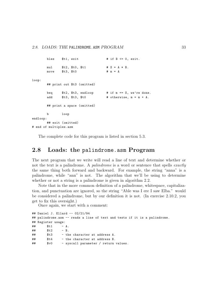 38. 38. 2.8. LOADS: THE PALINDROME.ASM PROGRAM 33 blez $t1, exit # if B <= 0, exit. mul $t2, $t0, $t1 # S = A * B. move $t3, $t0 # m = A loop: ## print out $t3 (omitted) beq $t2, $t3, endloop # if m == S, we’re done. add $t3, $t3, $t0 # otherwise, m = m + A. ## print a space (omitted) b loop endloop: ## exit (omitted) # end of multiples.asm The complete code for this program is listed in section 5.3. 2.8 Loads: the palindrome.asm Program The next program that we write will read a line of text and determine whether or not the text is a palindrome. A palindrome is a word or sentence that spells exactly the same thing both forward and backward. For example, the string “anna” is a palindrome, while “ann” is not. The algorithm that we’ll be using to determine whether or not a string is a palindrome is given in algorithm 2.2. Note that in the more common definition of a palindrome, whitespace, capitaliza- tion, and punctuation are ignored, so the string “Able was I ere I saw Elba.” would be considered a palindrome, but by our definition it is not. (In exercise 2.10.2, you get to fix this oversight.) Once again, we start with a comment: ## Daniel J. Ellard -- 02/21/94 ## palindrome.asm -- reads a line of text and tests if it is a palindrome. ## Register usage: ## $t1 - A. ## $t2 - B. ## $t3 - the character at address A. ## $t4 - the character at address B. ## $v0 - syscall parameter / return values.