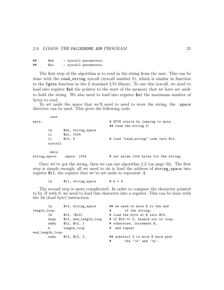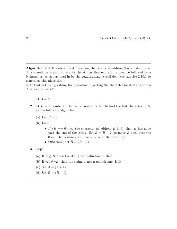 39. 39. 34 CHAPTER 2. MIPS TUTORIAL Algorithm 2.2 To determine if the string that starts at address S is a palindrome. This algorithm is appropriate for the strings that end with a newline followed by a 0 character, as strings read in by the read string syscall do. (See exercise 2.10.1 to generalize this algorithm.) Note that in this algorithm, the operation of getting the character located at address X is written as ∗X. 1. Let A = S. 2. Let B = a pointer to the last character of S. To find the last character in S, use the following algorithm: (a) Let B = S. (b) Loop: • If ∗B == 0 (i.e. the character at address B is 0), then B has gone past the end of the string. Set B = B − 2 (to move B back past the 0 and the newline), and continue with the next step. • Otherwise, set B = (B + 1). 3. Loop: (a) If A ≥ B, then the string is a palindrome. Halt. (b) If ∗A = ∗B, then the string is not a palindrome. Halt. (c) Set A = (A + 1). (d) Set B = (B − 1).
