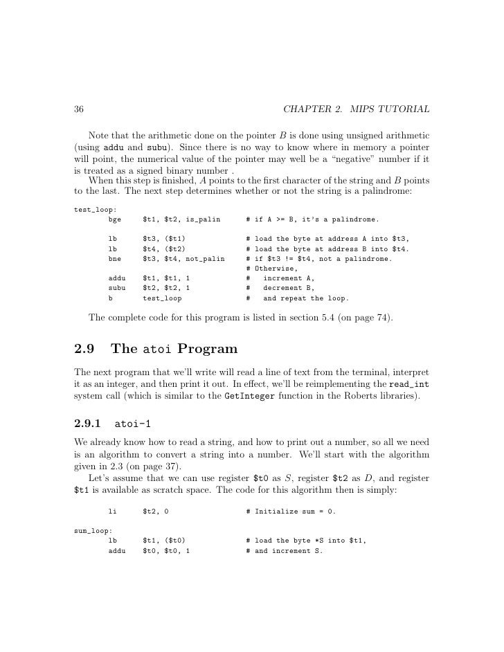 41. 41. 36 CHAPTER 2. MIPS TUTORIAL Note that the arithmetic done on the pointer B is done using unsigned arithmetic (using addu and subu). Since there is no way to know where in memory a pointer will point, the numerical value of the pointer may well be a “negative” number if it is treated as a signed binary number . When this step is finished, A points to the first character of the string and B points to the last. The next step determines whether or not the string is a palindrome: test_loop: bge $t1, $t2, is_palin # if A >= B, it’s a palindrome. lb $t3, ($t1) # load the byte at address A into $t3, lb $t4, ($t2) # load the byte at address B into $t4. bne $t3, $t4, not_palin # if $t3 != $t4, not a palindrome. # Otherwise, addu $t1, $t1, 1 # increment A, subu $t2, $t2, 1 # decrement B, b test_loop # and repeat the loop. The complete code for this program is listed in section 5.4 (on page 74). 2.9 The atoi Program The next program that we’ll write will read a line of text from the terminal, interpret it as an integer, and then print it out. In effect, we’ll be reimplementing the read_int system call (which is similar to the GetInteger function in the Roberts libraries). 2.9.1 atoi-1 We already know how to read a string, and how to print out a number, so all we need is an algorithm to convert a string into a number. We’ll start with the algorithm given in 2.3 (on page 37). Let’s assume that we can use register $t0 as S, register $t2 as D, and register $t1 is available as scratch space. The code for this algorithm then is simply: li $t2, 0 # Initialize sum = 0. sum_loop: lb $t1, ($t0) # load the byte *S into $t1, addu $t0, $t0, 1 # and increment S.