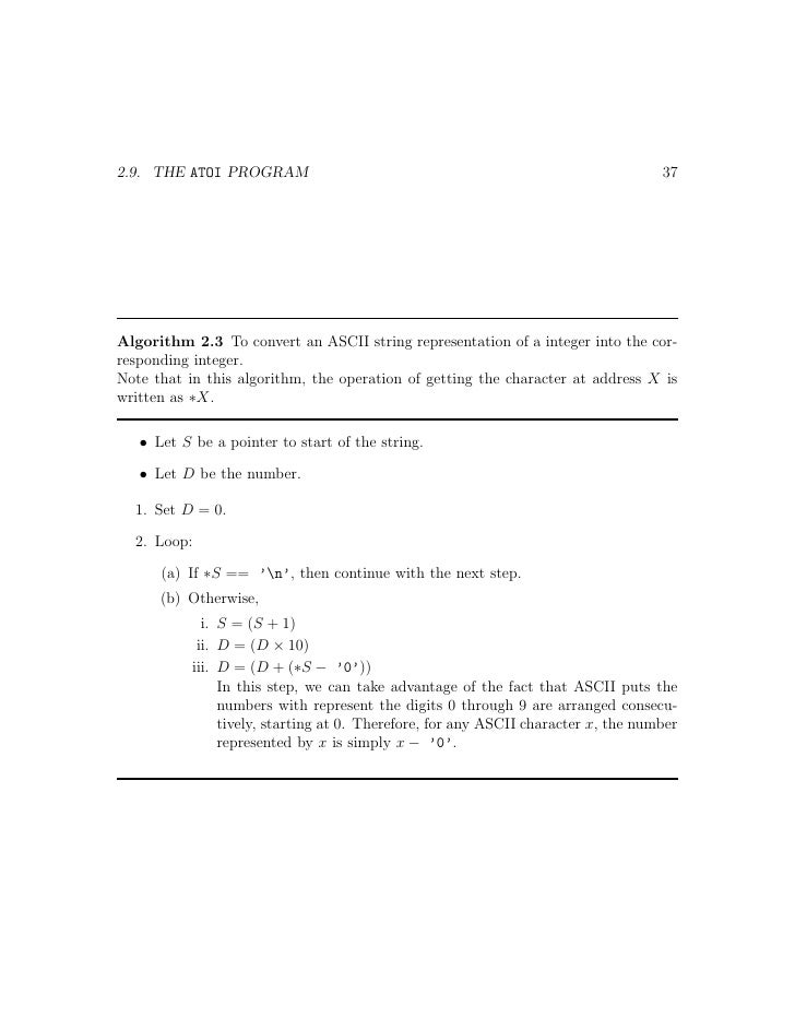 42. 42. 2.9. THE ATOI PROGRAM 37 Algorithm 2.3 To convert an ASCII string representation of a integer into the cor- responding integer. Note that in this algorithm, the operation of getting the character at address X is written as ∗X. • Let S be a pointer to start of the string. • Let D be the number. 1. Set D = 0. 2. Loop: (a) If ∗S == ’n’, then continue with the next step. (b) Otherwise, i. S = (S + 1) ii. D = (D × 10) iii. D = (D + (∗S − ’0’)) In this step, we can take advantage of the fact that ASCII puts the numbers with represent the digits 0 through 9 are arranged consecu- tively, starting at 0. Therefore, for any ASCII character x, the number represented by x is simply x − ’0’.