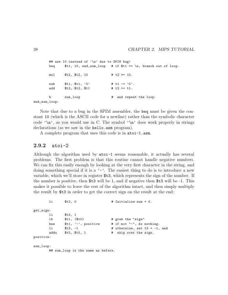 43. 43. 38 CHAPTER 2. MIPS TUTORIAL ## use 10 instead of ’n’ due to SPIM bug! beq $t1, 10, end_sum_loop # if $t1 == n, branch out of loop. mul $t2, $t2, 10 # t2 *= 10. sub $t1, $t1, ’0’ # t1 -= ’0’. add $t2, $t2, $t1 # t2 += t1. b sum_loop # and repeat the loop. end_sum_loop: Note that due to a bug in the SPIM assembler, the beq must be given the con- stant 10 (which is the ASCII code for a newline) rather than the symbolic character code ’n’, as you would use in C. The symbol ’n’ does work properly in strings declarations (as we saw in the hello.asm program). A complete program that uses this code is in atoi-1.asm. 2.9.2 atoi-2 Although the algorithm used by atoi-1 seems reasonable, it actually has several problems. The first problem is that this routine cannot handle negative numbers. We can fix this easily enough by looking at the very first character in the string, and doing something special if it is a ’-’. The easiest thing to do is to introduce a new variable, which we’ll store in register $t3, which represents the sign of the number. If the number is positive, then $t3 will be 1, and if negative then $t3 will be -1. This makes it possible to leave the rest of the algorithm intact, and then simply multiply the result by $t3 in order to get the correct sign on the result at the end: li $t2, 0 # Initialize sum = 0. get_sign: li $t3, 1 lb $t1, ($t0) # grab the "sign" bne $t1, ’-’, positive # if not "-", do nothing. li $t3, -1 # otherwise, set t3 = -1, and addu $t0, $t0, 1 # skip over the sign. positive: sum_loop: ## sum_loop is the same as before.