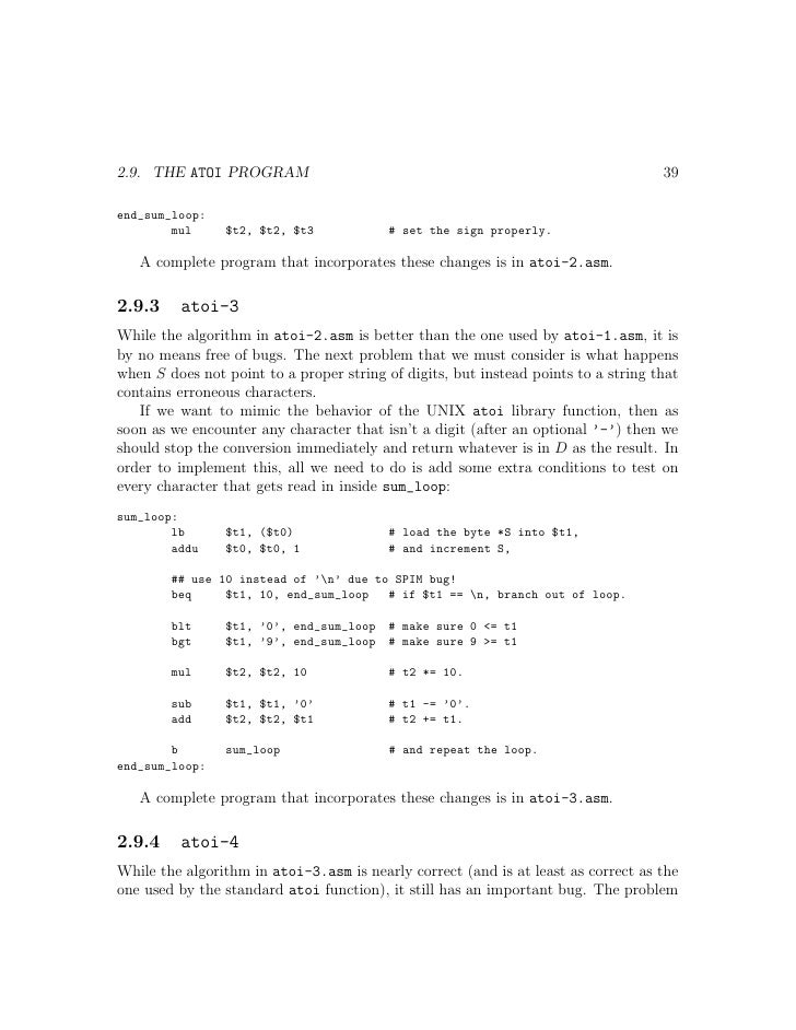 44. 44. 2.9. THE ATOI PROGRAM 39 end_sum_loop: mul $t2, $t2, $t3 # set the sign properly. A complete program that incorporates these changes is in atoi-2.asm. 2.9.3 atoi-3 While the algorithm in atoi-2.asm is better than the one used by atoi-1.asm, it is by no means free of bugs. The next problem that we must consider is what happens when S does not point to a proper string of digits, but instead points to a string that contains erroneous characters. If we want to mimic the behavior of the UNIX atoi library function, then as soon as we encounter any character that isn’t a digit (after an optional ’-’) then we should stop the conversion immediately and return whatever is in D as the result. In order to implement this, all we need to do is add some extra conditions to test on every character that gets read in inside sum_loop: sum_loop: lb $t1, ($t0) # load the byte *S into $t1, addu $t0, $t0, 1 # and increment S, ## use 10 instead of ’n’ due to SPIM bug! beq $t1, 10, end_sum_loop # if $t1 == n, branch out of loop. blt $t1, ’0’, end_sum_loop # make sure 0 <= t1 bgt $t1, ’9’, end_sum_loop # make sure 9 >= t1 mul $t2, $t2, 10 # t2 *= 10. sub $t1, $t1, ’0’ # t1 -= ’0’. add $t2, $t2, $t1 # t2 += t1. b sum_loop # and repeat the loop. end_sum_loop: A complete program that incorporates these changes is in atoi-3.asm. 2.9.4 atoi-4 While the algorithm in atoi-3.asm is nearly correct (and is at least as correct as the one used by the standard atoi function), it still has an important bug. The problem