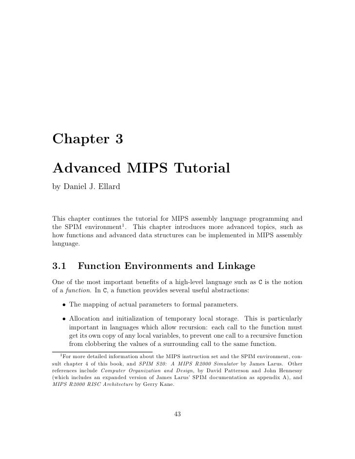 48. 48. Chapter 3 Advanced MIPS Tutorial by Daniel J. Ellard This chapter continues the tutorial for MIPS assembly language programming and the SPIM environment1 . This chapter introduces more advanced topics, such as how functions and advanced data structures can be implemented in MIPS assembly language. 3.1 Function Environments and Linkage One of the most important benefits of a high-level language such as C is the notion of a function. In C, a function provides several useful abstractions: • The mapping of actual parameters to formal parameters. • Allocation and initialization of temporary local storage. This is particularly important in languages which allow recursion: each call to the function must get its own copy of any local variables, to prevent one call to a recursive function from clobbering the values of a surrounding call to the same function. 1 For more detailed information about the MIPS instruction set and the SPIM environment, con- sult chapter 4 of this book, and SPIM S20: A MIPS R2000 Simulator by James Larus. Other references include Computer Organization and Design, by David Patterson and John Hennessy (which includes an expanded version of James Larus’ SPIM documentation as appendix A), and MIPS R2000 RISC Architecture by Gerry Kane. 43