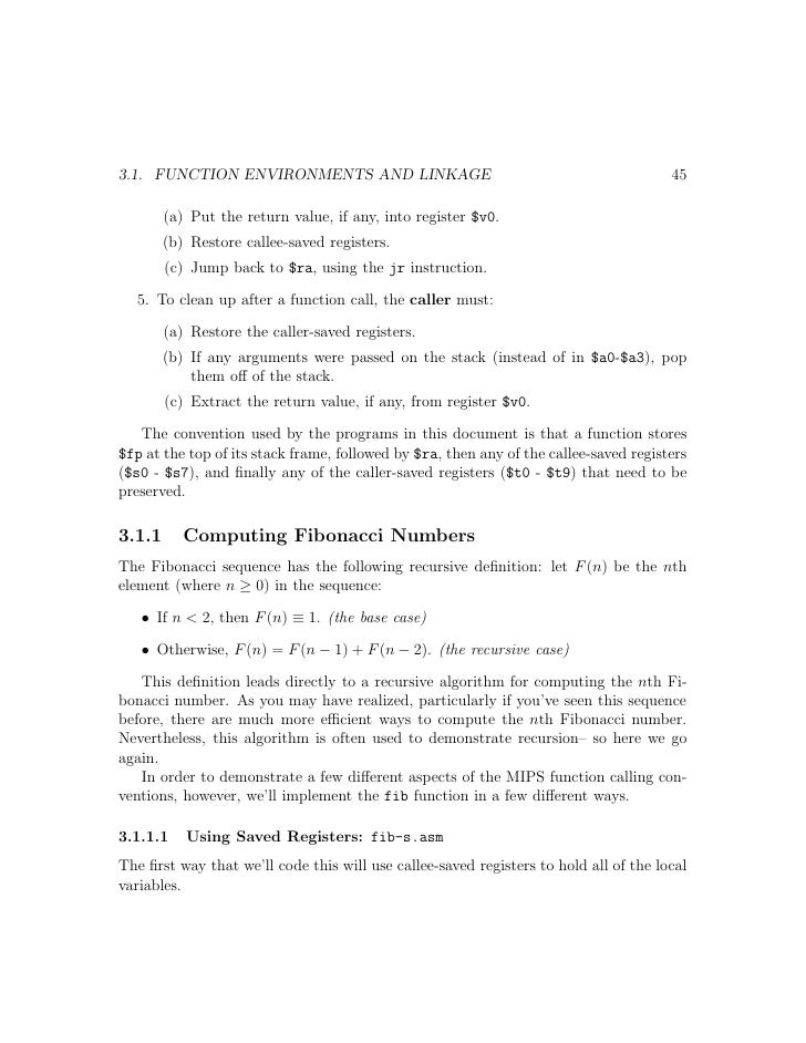 50. 50. 3.1. FUNCTION ENVIRONMENTS AND LINKAGE 45 (a) Put the return value, if any, into register $v0. (b) Restore callee-saved registers. (c) Jump back to $ra, using the jr instruction. 5. To clean up after a function call, the caller must: (a) Restore the caller-saved registers. (b) If any arguments were passed on the stack (instead of in $a0-$a3), pop them off of the stack. (c) Extract the return value, if any, from register $v0. The convention used by the programs in this document is that a function stores $fp at the top of its stack frame, followed by $ra, then any of the callee-saved registers ($s0 - $s7), and finally any of the caller-saved registers ($t0 - $t9) that need to be preserved. 3.1.1 Computing Fibonacci Numbers The Fibonacci sequence has the following recursive definition: let F (n) be the nth element (where n ≥ 0) in the sequence: • If n < 2, then F (n) ≡ 1. (the base case) • Otherwise, F (n) = F (n − 1) + F (n − 2). (the recursive case) This definition leads directly to a recursive algorithm for computing the nth Fi- bonacci number. As you may have realized, particularly if you’ve seen this sequence before, there are much more efficient ways to compute the nth Fibonacci number. Nevertheless, this algorithm is often used to demonstrate recursion– so here we go again. In order to demonstrate a few different aspects of the MIPS function calling con- ventions, however, we’ll implement the fib function in a few different ways. 3.1.1.1 Using Saved Registers: fib-s.asm The first way that we’ll code this will use callee-saved registers to hold all of the local variables.