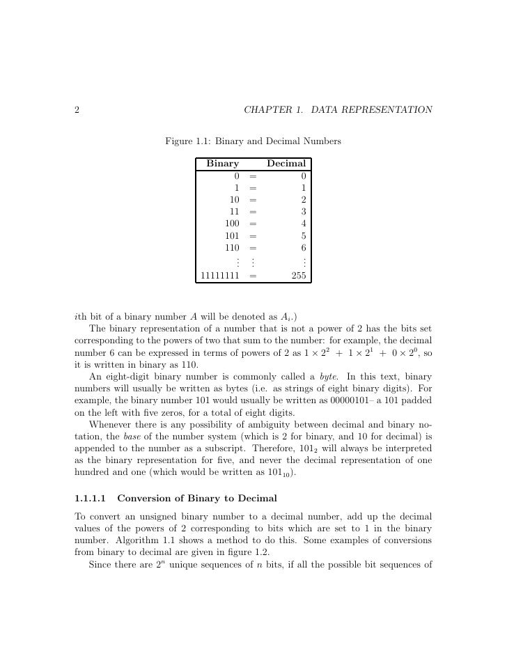 7. 7. 2 CHAPTER 1. DATA REPRESENTATION Figure 1.1: Binary and Decimal Numbers Binary Decimal 0 = 0 1 = 1 10 = 2 11 = 3 100 = 4 101 = 5 110 = 6 . . . . . . . . . 11111111 = 255 ith bit of a binary number A will be denoted as Ai .) The binary representation of a number that is not a power of 2 has the bits set corresponding to the powers of two that sum to the number: for example, the decimal number 6 can be expressed in terms of powers of 2 as 1 × 22 + 1 × 21 + 0 × 20 , so it is written in binary as 110. An eight-digit binary number is commonly called a byte. In this text, binary numbers will usually be written as bytes (i.e. as strings of eight binary digits). For example, the binary number 101 would usually be written as 00000101– a 101 padded on the left with five zeros, for a total of eight digits. Whenever there is any possibility of ambiguity between decimal and binary no- tation, the base of the number system (which is 2 for binary, and 10 for decimal) is appended to the number as a subscript. Therefore, 1012 will always be interpreted as the binary representation for five, and never the decimal representation of one hundred and one (which would be written as 10110 ). 1.1.1.1 Conversion of Binary to Decimal To convert an unsigned binary number to a decimal number, add up the decimal values of the powers of 2 corresponding to bits which are set to 1 in the binary number. Algorithm 1.1 shows a method to do this. Some examples of conversions from binary to decimal are given in figure 1.2. Since there are 2n unique sequences of n bits, if all the possible bit sequences of