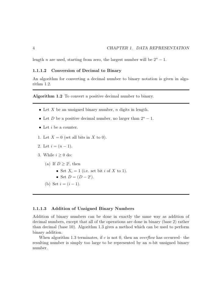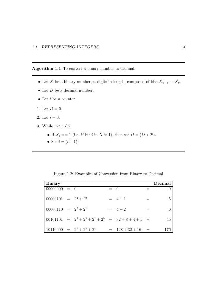 8. 8. 1.1. REPRESENTING INTEGERS 3 Algorithm 1.1 To convert a binary number to decimal. • Let X be a binary number, n digits in length, composed of bits Xn−1 · · · X0 . • Let D be a decimal number. • Let i be a counter. 1. Let D = 0. 2. Let i = 0. 3. While i < n do: • If Xi == 1 (i.e. if bit i in X is 1), then set D = (D + 2i ). • Set i = (i + 1). Figure 1.2: Examples of Conversion from Binary to Decimal Binary Decimal 00000000 = 0 = 0 = 0 00000101 = 22 + 20 = 4+1 = 5 00000110 = 22 + 21 = 4+2 = 6 00101101 = 25 + 23 + 22 + 20 = 32 + 8 + 4 + 1 = 45 10110000 = 27 + 25 + 24 = 128 + 32 + 16 = 176