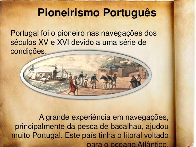 9. 9. Pioneirismo PortuguêsPortugal foi o pioneiro nas navegações dosséculos XV e XVI devido a uma série decondições. A grande experiência em navegações, principalmente da pesca de bacalhau, ajudoumuito Portugal. Este país tinha o litoral voltado