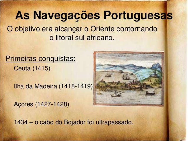 10. 10. As Navegações PortuguesasO objetivo era alcançar o Oriente contornando o litoral sul africano.Primeiras conquistas: Ceuta (1415) Ilha da Madeira (1418-1419) Açores (1427-1428) 1434 – o cabo do Bojador foi ultrapassado.