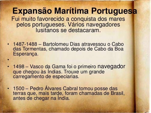 11. 11. Expansão Marítima Portuguesa Fui muito favorecido a conquista dos mares pelos portugueses. Vários navegadores lusitanos se destacaram.• 1487-1488 – Bartolomeu Dias atravessou o Cabo das Tormentas, chamado depois de Cabo da Boa Esperança.•• 1498 – Vasco da Gama foi o primeiro navegador que chegou às Índias. Trouxe um grande carregamento de especiarias.• 1500 – Pedro Álvares Cabral tomou posse das terras que, mais tarde, foram chamadas de Brasil, antes de chegar na Índia.