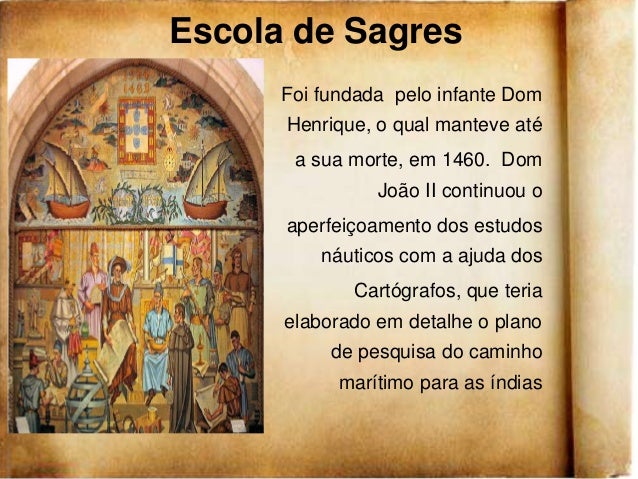 12. 12. Escola de Sagres Foi fundada pelo infante Dom Henrique, o qual manteve até a sua morte, em 1460. Dom João II continuou o aperfeiçoamento dos estudos náuticos com a ajuda dos Cartógrafos, que teria elaborado em detalhe o plano de pesquisa do caminho marítimo para as índias