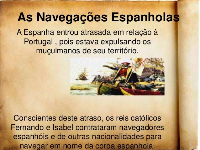 13. 13. As Navegações Espanholas A Espanha entrou atrasada em relação à Portugal , pois estava expulsando os muçulmanos de seu território. Conscientes deste atraso, os reis católicosFernando e Isabel contrataram navegadores espanhóis e de outras nacionalidades para navegar em nome da coroa espanhola.
