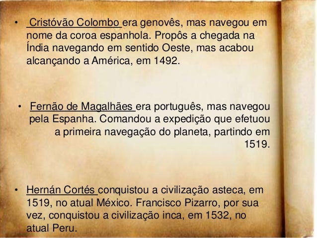 14. 14. • Cristóvão Colombo era genovês, mas navegou em nome da coroa espanhola. Propôs a chegada na Índia navegando em sentido Oeste, mas acabou alcançando a América, em 1492.• Fernão de Magalhães era português, mas navegou pela Espanha. Comandou a expedição que efetuou a primeira navegação do planeta, partindo em 1519.• Hernán Cortés conquistou a civilização asteca, em 1519, no atual México. Francisco Pizarro, por sua vez, conquistou a civilização inca, em 1532, no atual Peru.