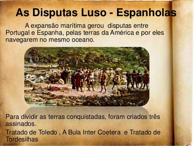 15. 15. As Disputas Luso - Espanholas A expansão marítima gerou disputas entrePortugal e Espanha, pelas terras da América e por elesnavegarem no mesmo oceano.Para dividir as terras conquistadas, foram criados trêsassinados.Tratado de Toledo , A Bula Inter Coetera e Tratado deTordesilhas