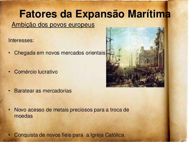2. 2. Fatores da Expansão Marítima Ambição dos povos europeusInteresses:• Chegada em novos mercados orientais• Comércio lucrativo• Baratear as mercadorias• Novo acesso de metais preciosos para a troca de moedas• Conquista de novos fiéis para a Igreja Católica