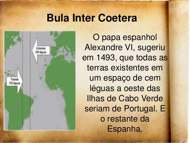 17. 17. Bula Inter Coetera O papa espanhol Alexandre VI, sugeriu em 1493, que todas as terras existentes em um espaço de cem léguas a oeste das Ilhas de Cabo Verde seriam de Portugal. E o restante da Espanha.
