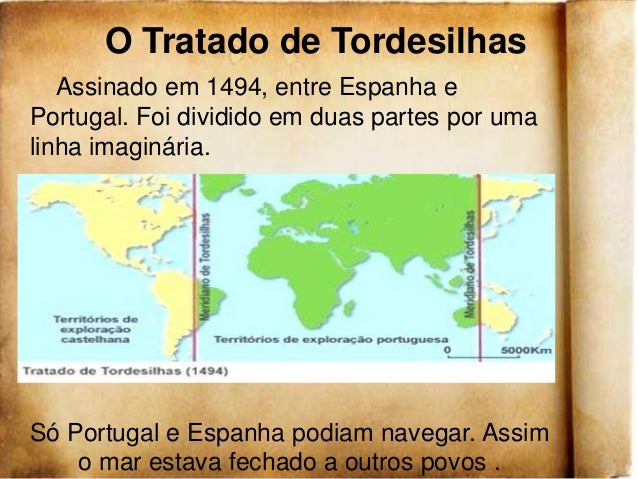 18. 18. O Tratado de Tordesilhas Assinado em 1494, entre Espanha ePortugal. Foi dividido em duas partes por umalinha imaginária.Só Portugal e Espanha podiam navegar. Assim o mar estava fechado a outros povos .