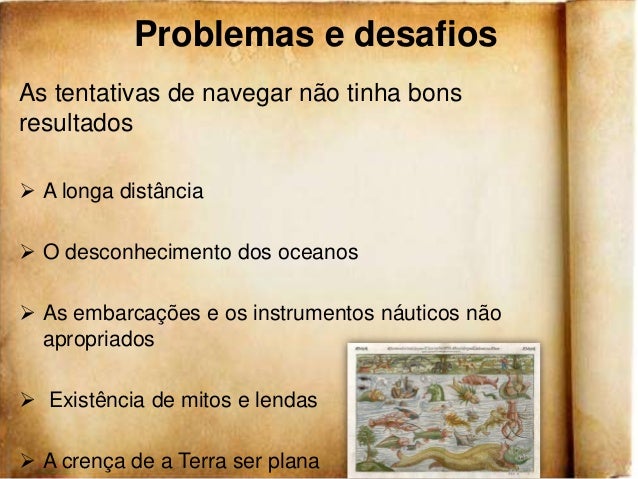 4. 4. Problemas e desafiosAs tentativas de navegar não tinha bonsresultados A longa distância O desconhecimento dos oceanos As embarcações e os instrumentos náuticos não apropriados Existência de mitos e lendas A crença de a Terra ser plana