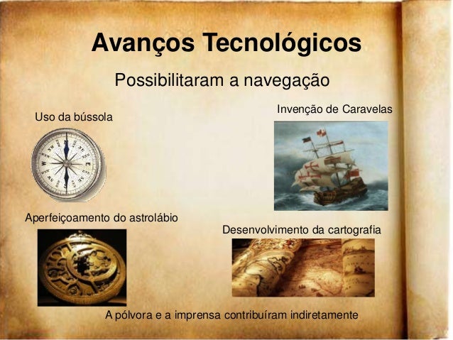 5. 5. Avanços Tecnológicos Possibilitaram a navegação Invenção de Caravelas Uso da bússolaAperfeiçoamento do astrolábio Desenvolvimento da cartografia A pólvora e a imprensa contribuíram indiretamente