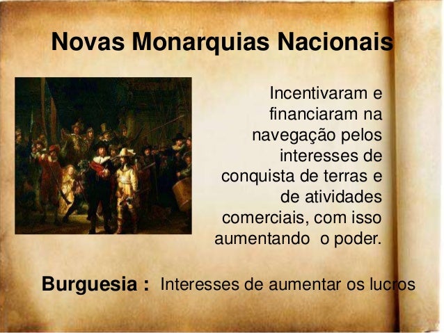 6. 6. Novas Monarquias Nacionais Incentivaram e financiaram na navegação pelos interesses de conquista de terras e de atividades comerciais, com isso aumentando o poder.Burguesia : Interesses de aumentar os lucros