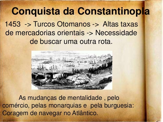 7. 7. Conquista da Constantinopla1453 -> Turcos Otomanos -> Altas taxasde mercadorias orientais -> Necessidade de buscar uma outra rota. As mudanças de mentalidade , pelocomércio, pelas monarquias e pela burguesia:Coragem de navegar no Atlântico.